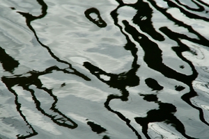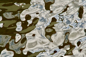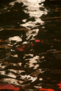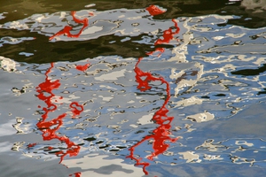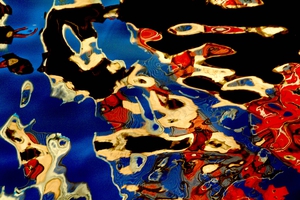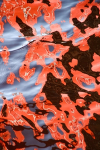 2026Foto van waterspiegeling met rood en zwart. De golf is zichtbaar en geeft beweging.